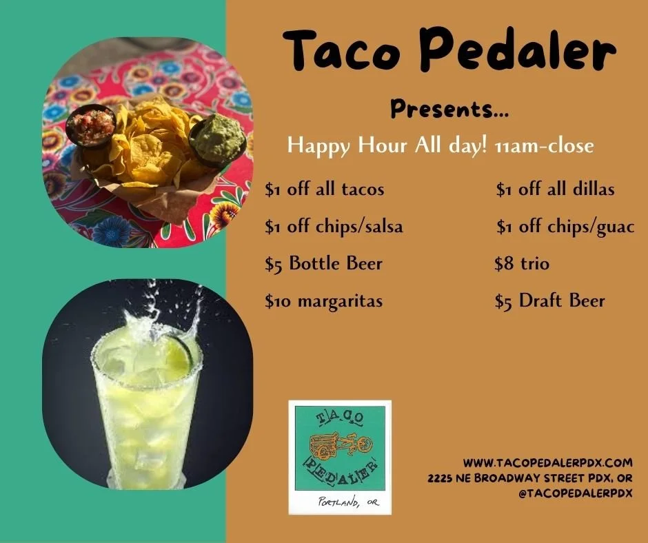 Whats the deal? Oh, just all-day HAPPY HOUR at Taco Pedaler.Check us out open from 11-8 Wed-Sun.